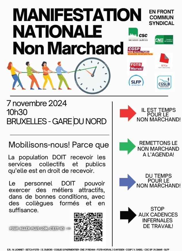 Rappelons aux gouvernements en place et à ceux en cours de formation que nous souhaitons des politiques qui garantissent la santé et le bien-être de tous·tes les citoyen·nes, qui assurent, aussi, que nos métiers soient tenables et attractifs. Soyons des dizaines de milliers à Bruxelles pour dire qu’il est (grand) temps pour le non marchand !