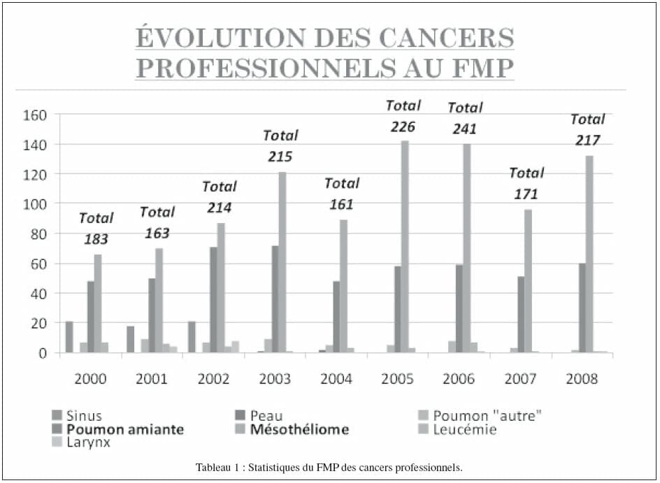 Les cancers pulmonaires reconnus par le FMP sont ceux dus aux agents suivants : le chrome hexavalent, le bis-chlorométhyléther, le nickel, l’arsenic, les hydrocarbures aromatiques polycycliques (H.A.P.), le béryllium et l’amiante. Toutes ces substances sont reconnues comme des agents cancérogènes certains (groupe I) par le Centre international de Recherche sur le Cancer (CIRC ou IARC en anglais). Selon les données épidémiologiques1, 15% des cancers chez l’homme et 5% des cancers chez la femme, toutes origines confondues, seraient d’origine professionnelle. Les cancers bronchopulmonaires et le mésothéliome pleural constituent les cancers professionnels les plus fréquents (http://www.fbz.fgov.be/Pdfdocs/Rapports/premieres_statistiques_2009.pdf). En 2003, en Belgique, selon la Fondation contre le Cancer, les estimations étaient les suivantes : 7% de cancers (tous types de néoplasies) d’origine professionnelle chez l’homme, 1% chez la femme, ce qui correspondrait à 1.600 cas/an. Le pourcentage de cancers pulmonaires dus à l’amiante, selon les données épidémiologiques, pourrait varier de 7 à 15%. Certains auteurs estiment même que l’amiante serait responsable de plus de la moitié des cas de cancers bronchopulmonaires professionnels. Une sous-déclaration d’origine multifactorielle Le problème de la réparation du cancer professionnel est avant tout un concept social et économique. La décision de reconnaître tel ou tel type de cancer comme ayant une origine professionnelle ne s’appuie pas que sur une base scientifique. A quel niveau de risque relatif et de fraction étiologique de risque faut-il placer la limite ? Ceci relève souvent de discussions avec les partenaires sociaux et il n’y a pas de critères précis ou standardisés, sauf pour l’amiante. Cela explique les différences dans le nombre de cas de cancers professionnels reconnus dans les pays de l’Union. Par ailleurs, vu le temps de latence, les cancers professionnels surviennent bien souvent après l’âge de la retraite, lorsque le travailleur n’a plus de contact avec le médecin du travail de son entreprise. Vu le cloisonnement de notre système de soins de santé, le passé professionnel du malade devient totalement inconnu et n’est pas la préoccupation première du secteur curatif. Si un mésothéliome oriente d’emblée le clinicien vers la recherche d’une exposition à l’amiante, il n’y a en revanche aucune caractéristique clinique, radiologique ou anatomopathologique particulière permettant de distinguer l’étiologie professionnelle d’un cancer bronchopulmonaire, de la cause première qui reste le tabagisme. L’absence de recherche systématique d’une relation possible entre un cancer bronchopulmonaire et des antécédents professionnels a pour conséquence une sous-déclaration et une sous-reconnaissance des cas professionnels comme en témoignent les chiffres de reconnaissance du FMP (tableau 1).